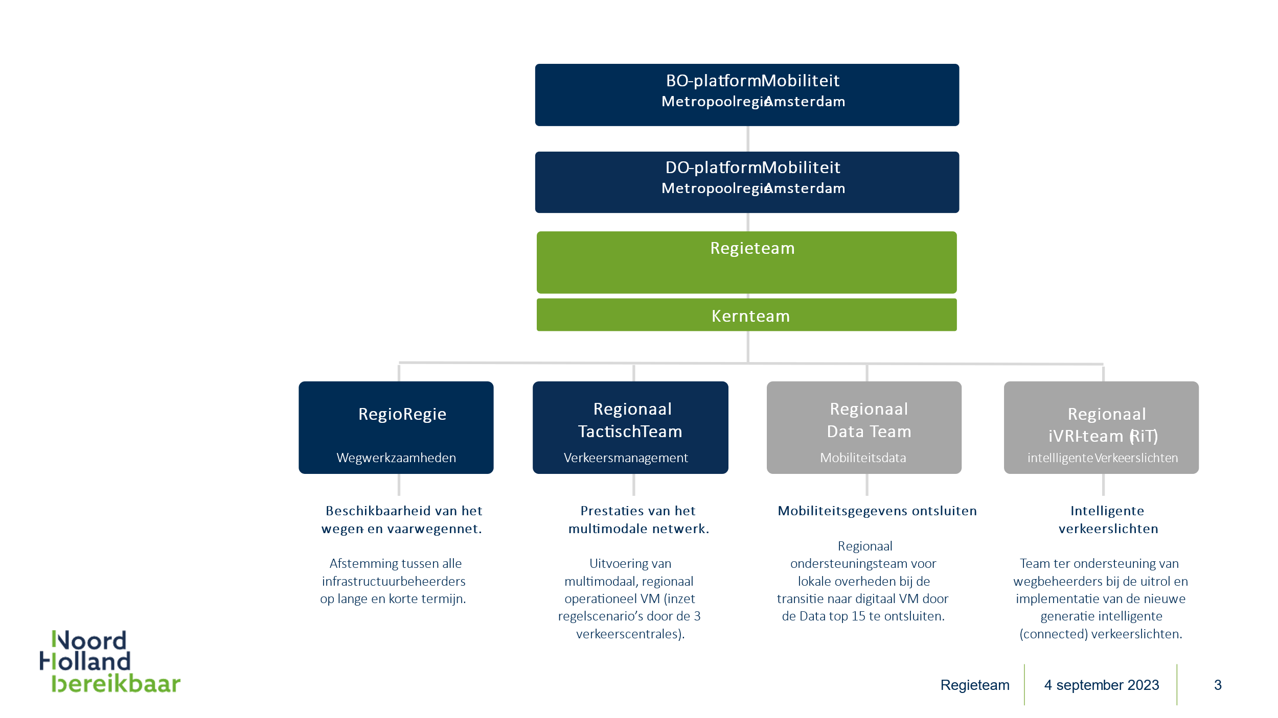Het Regieteam is de netwerkregisseur, het schakelpunt om in Noord-Holland de strategische beleidsdoelen op het gebied van verkeer en vervoer – nu; duurzaam (schoon), veilig (slim) en vlot – in samenhang te beschouwen en te vertalen naar de uitvoering. De nadruk hierbij ligt specifiek op het integraal (multimodaal) managen van het verkeersnetwerk.